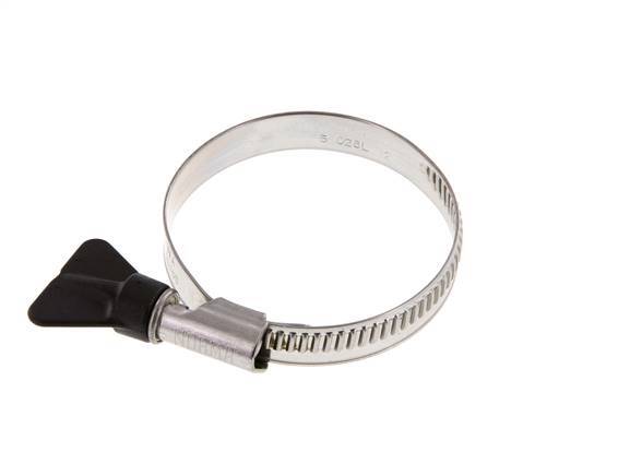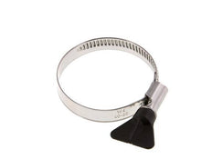 Norma hose clamp with an adjustable range of 40 - 60 mm and with a butterfly handle. The butterfly handle can be twisted to tighten or loosen the hose clamp through the worm gear design.. It has a band width of 12 mm. This hose clamp is made according to DIN 3017-1 standard. The housing material is stainless steel 304. The hose clamp is tightened or loosened by using a screwdriver due to the worm gear design.