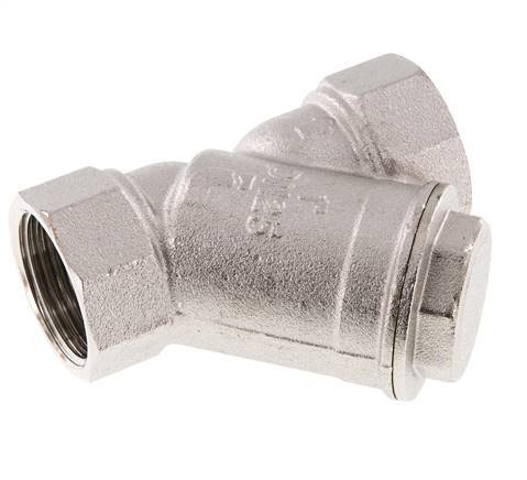 Nickel-plated brass Y-strainer with G 1 inch female threads and a stainless steel mesh with a 0.5 mm filter size. For media up to 20 bar (290 psi) at temperatures between -20 °C and 110 °C (-4 to 230 °F). To be used in a single flow direction (see arrow on housing). The residue collects in the filter and can be cleaned by unscrewing the sealing cap. The seal is made of NBR (nitrile rubber).