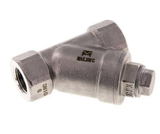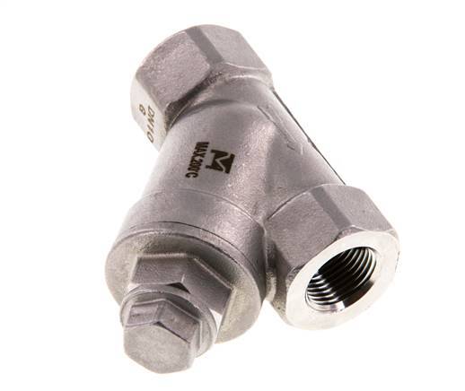 Stainless steel Y-strainer with G 3/8 inch female threads and a stainless steel mesh with a 0.6 mm filter size. For media up to 40 bar (580 psi) at temperatures between -20 °C and 200 °C (-4 to 392 °F). To be used in a single flow direction (see arrow on housing). The residue collects in the filter and can be cleaned by unscrewing the sealing cap.