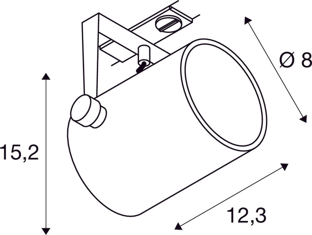 Compact cylindrical track spotlight featuring 350° rotation and 90° tilt capabilities, designed for single-circuit 240V track systems. Compatible with GU10 light sources up to 25W (energy classes E to A++). Constructed from aluminum with dimensions of 8x16x12.5cm (ØxHxL). Operates on 230V and includes track adapter. Light source not included.