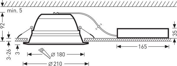 The light source can be replaced in accordance with the requirements for ecological design (EU Regulation 2019/2020). Ceiling ring made of sheet steel, white powder coated. Ceiling ring white powder coated (RAL 9016). Exterior dimensions of ceiling ring Ø 210 mm, fixture height 95 mm.